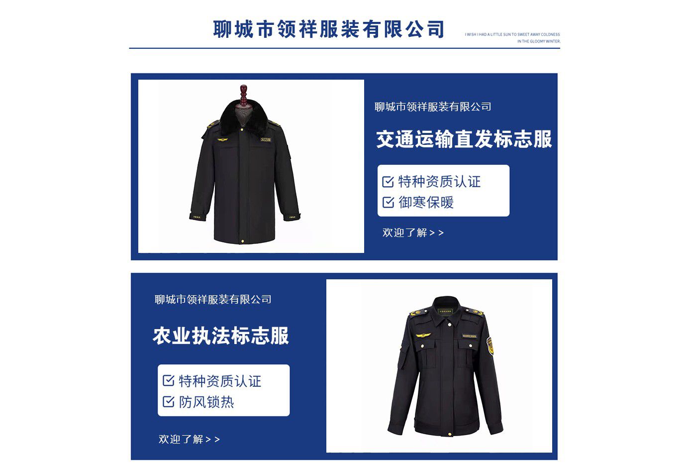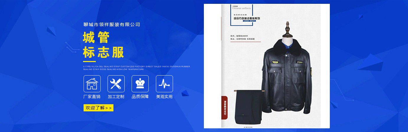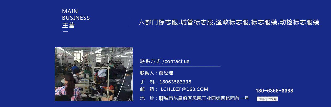 聊城市領(lǐng)祥服裝有限公司主主要生產(chǎn)六部門標志服,城管標志服,漁政標志服,標志服裝,動檢標志服裝,標志服裝廠等產(chǎn)品,款式新穎,做工精細,可根據(jù)用戶要求批量定做。公司成立以來,已為各行業(yè)數(shù)千家企業(yè)、集團承制了職業(yè)制服。 多年來,我公司本著“質(zhì)優(yōu)高效,守約重譽”的經(jīng)營理念給廣大新老客戶提供質(zhì)優(yōu)價廉的產(chǎn)品和售后服務。憑借良好的信譽,雄厚的實力,優(yōu)質(zhì)的產(chǎn)品,低廉的價格愿與新老客戶真誠協(xié)作,業(yè)務遍布全國各地,是山東優(yōu)秀的標志服裝廠,歡迎新老客戶參觀考察!  公司生產(chǎn)的職業(yè)服飾均以標準的質(zhì)量,頂尖精湛的技術(shù)為基礎(chǔ),以客戶的滿意為根本,全程采用電腦輔助設(shè)計制服,成衣、服飾配件(領(lǐng)帶,領(lǐng)結(jié),紐扣,帽子,企業(yè)標志等)均可定織定染,普遍采用進口或合資優(yōu)質(zhì)輔料,尺碼按身高和體型劃分或量體定制。每一道工序,每一個生產(chǎn)環(huán)節(jié)精雕細琢,充分體現(xiàn)了以質(zhì)量求生存,以信譽求發(fā)展的理念。并以準確的市場定位,先進的營銷理念,贏得廣大客戶的信賴支持!  公司宗旨:“團結(jié)、服務、創(chuàng)新”。公司方針:“專業(yè)創(chuàng)造輝煌,質(zhì)量保證未來,用心換得人心”。熱誠歡迎業(yè)界同仁來公司洽談!...